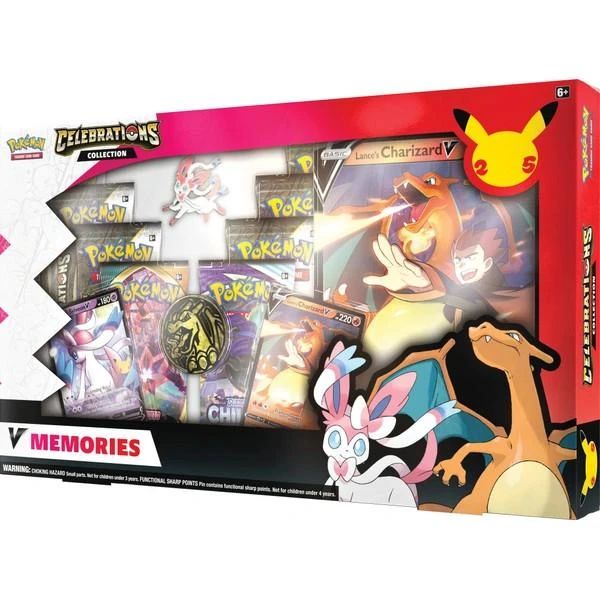 Elite Trainer Lance teams up with his partner Charizard to unleash an impressive Flamethrower, and an unusually shadowy Sylveon wields its Tricky Ribbon to keep your opponents off guard. You’ll also find a collector’s pin and coin, plus a handful of Pokémon TCG: Celebrations booster packs!
