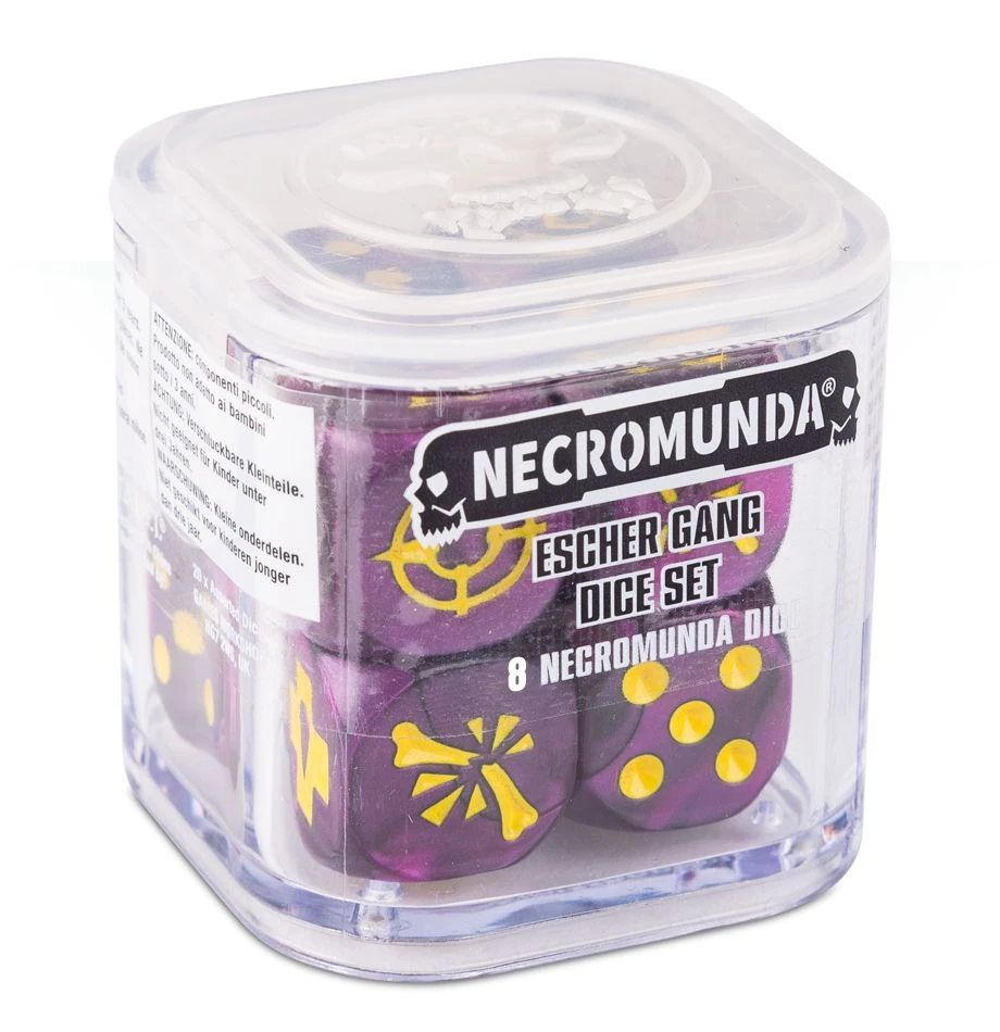 These six-sided, round-edged dice are cast in weathered, dust-touched purple plastic with gold-coloured pips and designs. They measure 16mm along each edge, and are packaged in a clear plastic crystal gem cube container.