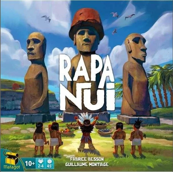Each game turn takes place in 3 phases. During the first phase, each player sends one of his figurines on the board, each in turn, until all the figurines have been placed. The sorcerer will decide the order of the next turn, and the villagers are placed on the board to become transporters or scupltor. Thanks to the number of sculptors present in the Quarry, each player collects Moais of different sizes. Moai or Pukao must be transported through a continuous chain of transporters, whether they are from your clan or not. But be careful, you offer resource to your opponents when you use their transporter! Once arrived at your destination, you can erect the Moai, to take the Ahu tile you can play at your tune, as well as one or more Resources depending on the size of the Moai. Styling your Moais will allow you to exchange resources to acquire Offering tiles. Atthe end of a round, if the number of ahu with no Moai is less than or equal to the number of players, the game ends,The winner is the player with the most victory points earned thanks to the Offering and Outstanding Offering tiles.
