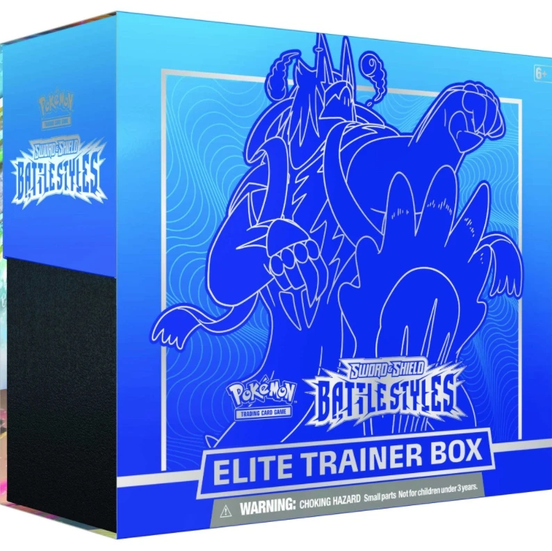 SWSH Battle Styles Elite Trainer Box including Sleeves, Dividers and a Storage Box all featuring designs of The sets Mascot Pokemon. Included also are a set of dice, 8 SWSH Battle Styles Booster Packs, and a code card for the Pokemon online TCG.