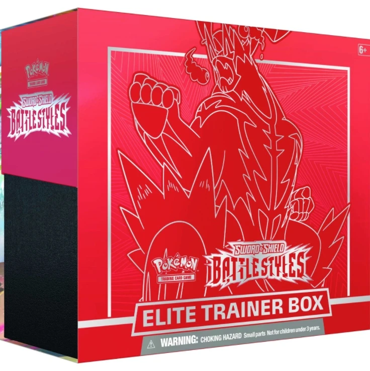 SWSH Battle Styles Elite Trainer Box including Sleeves, Dividers and a Storage Box all featuring designs of The sets Mascot Pokemon. Included also are a set of dice, 8 SWSH Battle Styles Booster Packs, and a code card for the Pokemon online TCG.