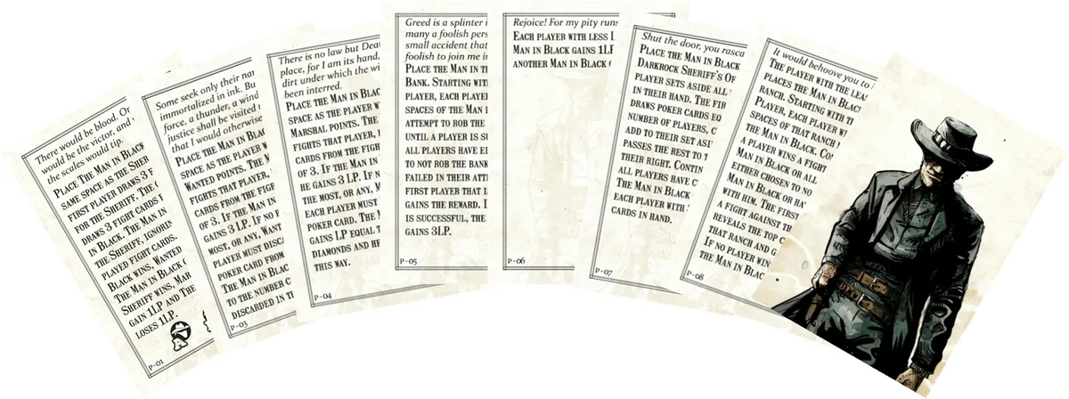 A set of 6 Man In Black and one rules reference cards for Western Legends.
